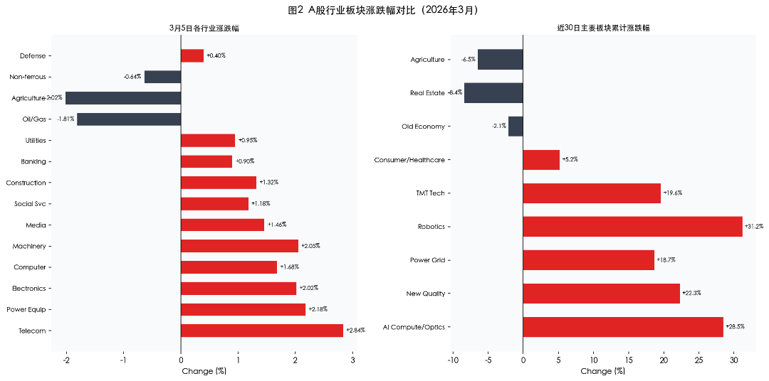 图2 A股行业板块涨跌幅对比(2026年3月)注:左图为3月5日单日数据(来源:数据宝),右图为近30日累计涨跌幅(来源:中财数碳整理)。