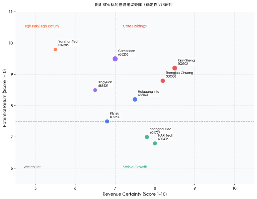 图8 核心标的投资建议矩阵(确定性 vs 弹性)注:气泡大小代表研究覆盖关注度,图表仅用于示意分析框架,不构成具体投资建议。