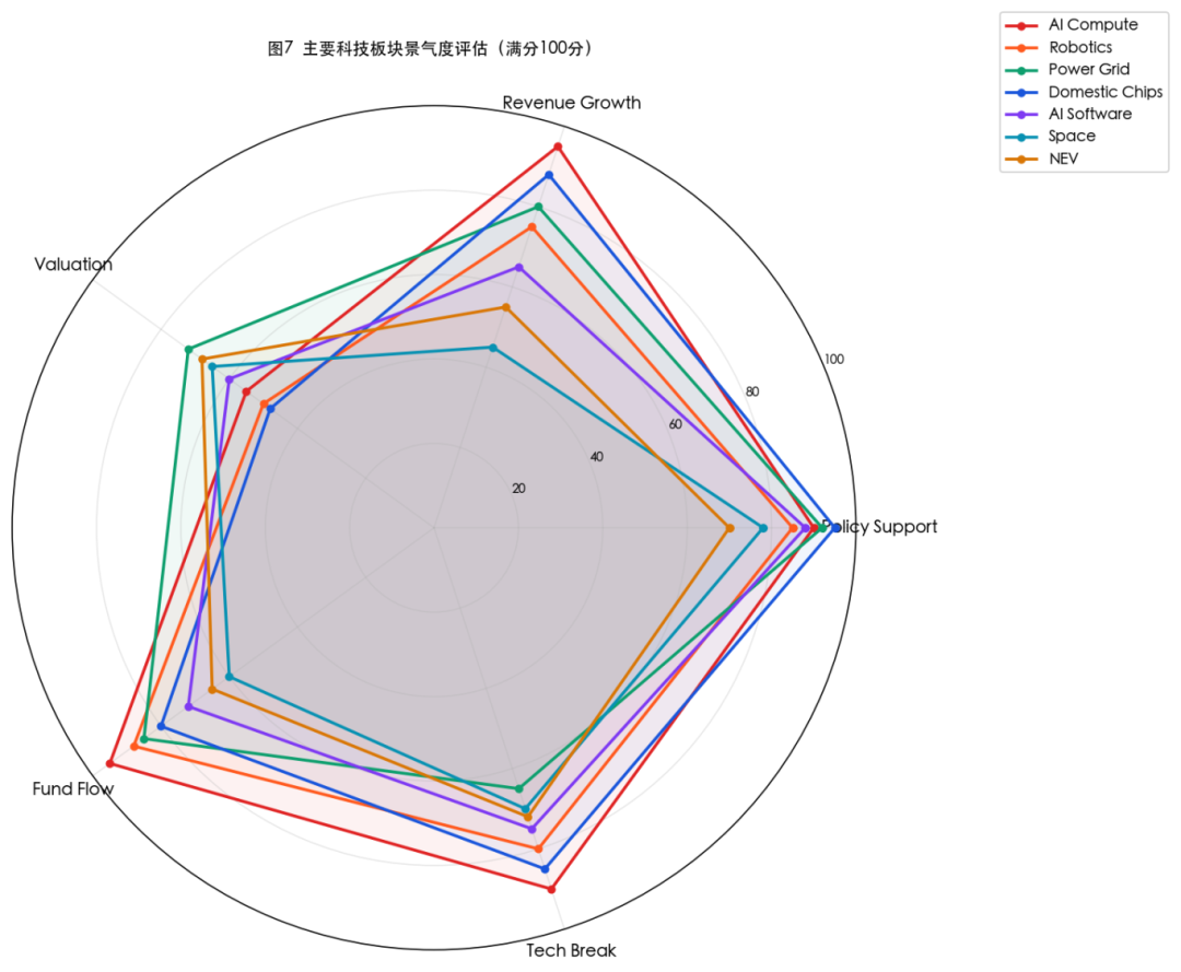 从政策支持度、业绩增速、估值吸引力、资金热度、技术突破度五个维度,对主要科技板块进行综合评分(见图7):