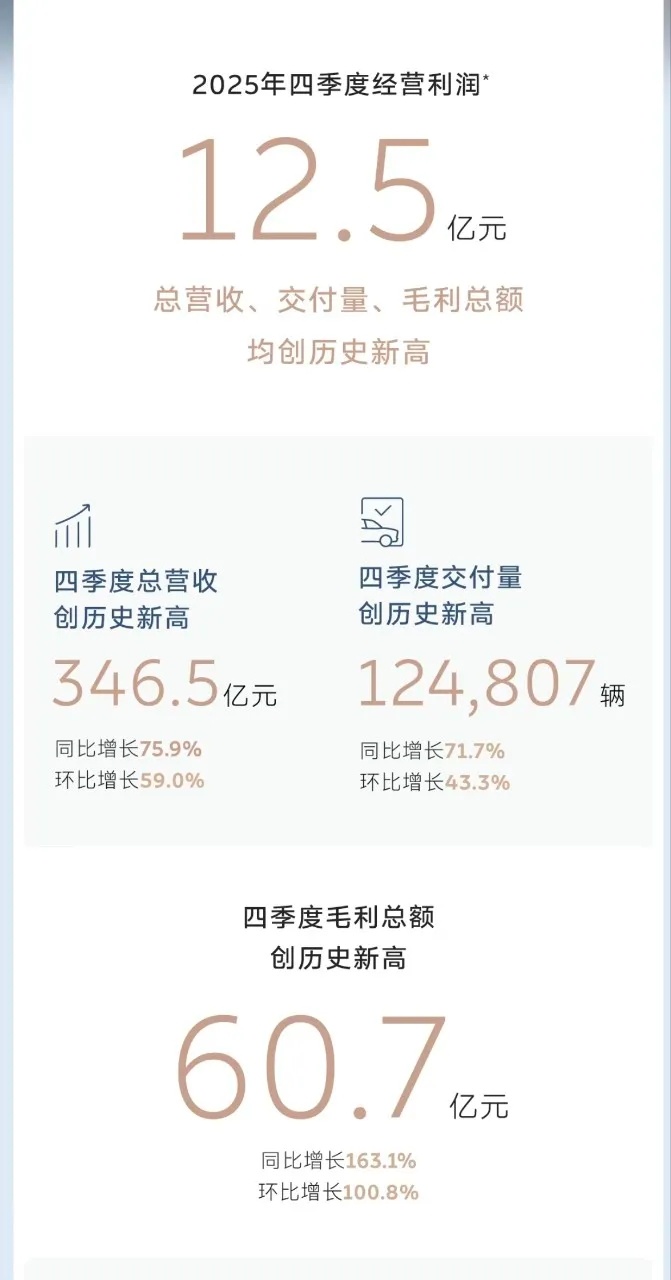 蔚来将「扭亏为盈」的成就主要归功于「2025 年第四季度销售量的持续增长」以及「有利的产品组合推动车辆毛利率优化」。